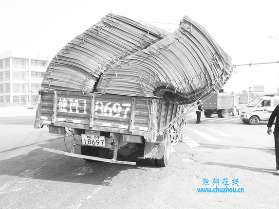 当天上午10时许,该大队西阳中队民警在滁城上海路巡逻时,发现这一辆颤巍巍的货车。该车所载纸板超高,且严重倾斜,遇到路面不平或者急转弯时,极易侧翻。见此情形,民警立即使用喊话器,引导该车缓慢靠边驶离主干道。