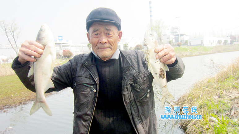 图为看管鱼塘的老杨站在鱼塘岸边,手拿两条一斤多重的死鱼,痛心不已。记者 王太新摄
