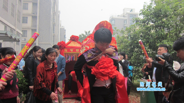 上周五上午10点左右,一支特别的迎亲队伍从滁城蓝天小区走出,只见领头的是一个胸戴大红花的帅小伙,迎亲双喜牌紧随其后,再后面是4名身着古时服装的轿夫抬着一顶花轿,新娘头顶红盖头,端坐在花轿中。一路上,迎亲队伍敲着锣鼓、吹着唢呐,热闹非凡,引得路人纷纷驻足观看,连称这婚礼办得喜庆。