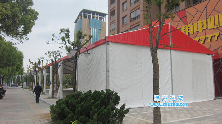 《皖东晨刊》记者核实报道:4月25日上午,记者接到报料后迅速赶到现场,发现位于会峰西路上的这家房产公司经销中心的门前已经搭起了一个长约20米、宽5米左右的大帐篷,帐篷内几名工人正在忙着搭建一个舞台。该房产公司经营中心的一位工作人员称,他们4月26日要做一个宣传活动,之前已通过相关部门批准。