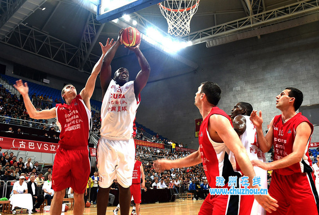 核心提示: “国际男篮”对抗赛我市上演 5月12日晚,应市体育局、篮球协会邀请,立陶宛共和国LKL明星队与古巴国家男子篮球队举行的“国际男子篮球对抗赛”在体育馆精彩上演。