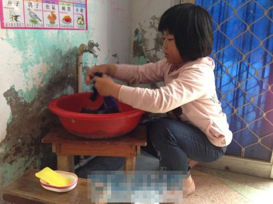 5月16日中午11点半,放学到家后,刚刚10岁的彤彤看到姑姑来了并煮了饭,便抄起妹妹换下的两件衣服,开始洗衣服,放水、打肥皂、搓揉,动作熟练。放水的间隙,彤彤还不忘给自己养的几条蚕宝宝换上新鲜的桑叶。