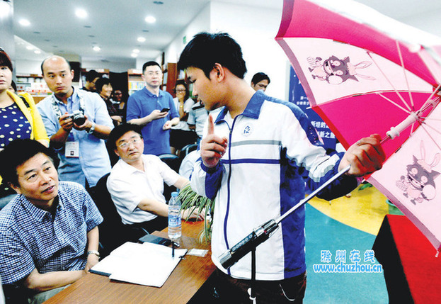 5月22日,由团市委等部门联合开展的第一届安徽青少年科技发明大赛滁州赛区进行作品初评。全市近50件参赛作品参加初评,将从中产生5至10件作品参加全省总决赛。全省总决赛特等奖及一等奖得主将可免费获得“以色列创新之旅”,参观以色列最具代表性的人文景观、科技景观和创新项目。图为参赛选手向评委展示作品“梦幻伞”。记者王家国摄