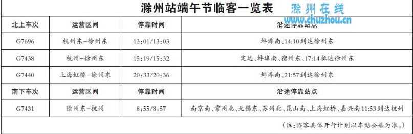 “根据上级铁路部门安排,今年端午小长假期间,我们站计划增开4趟临时旅客列车,其中,上行3趟、下行1趟(具体车次及停靠时间等详见附表)。”滁州站站长陶仁宝在采访中如是说,“特别值得一提的是,此次增开的4趟临客均为‘G’字头旅客列车,运营区间也主要集中在杭州和徐州之间。”经查,G7696次临时旅客列车已于5月25日上线运营,其余3趟临客将于5月30日上线载客,它们均计划开行至6月2日。