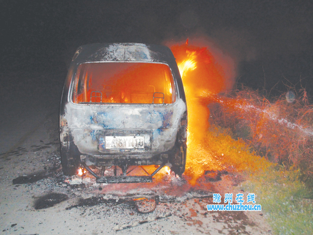 当晚20时许,明光市居民彭某驾驶一辆面包车,行驶在三界镇村村通公路上时,车辆突然发生故障熄火。虽经连续几次启动,面包车依旧动弹不得,彭某只好到附近村子找车来拖。不曾想,彭某刚走出几步,身后面包车突然着起火来,火势不断朝车尾部蔓延。