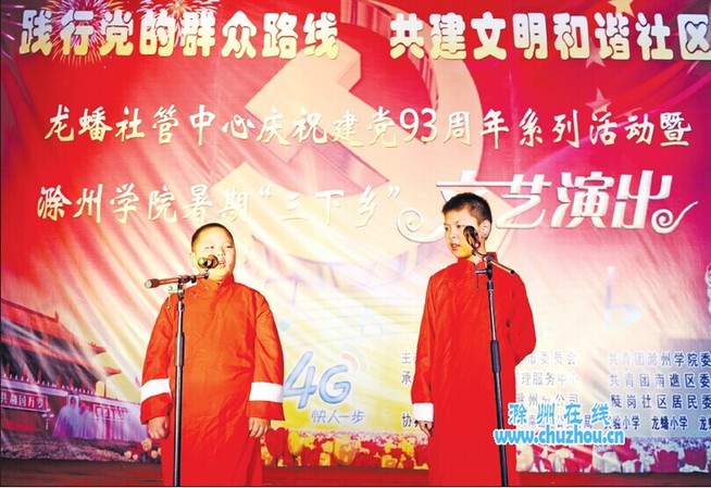 昨晚,南谯区龙蟠小学操场上人头攒动,一场精彩的文艺演出吸引四方八邻齐聚与此,边纳凉边欣赏。由团市委和共青团滁州学院委员会主办,龙蟠社管中心,共青团南谯区委等单位承办的“践行党的群众路线共建文明和谐社区”,龙蟠社管中心庆建党93周年系列活动暨滁州学院暑期“三下乡”文艺演出伴着徐徐凉风拉开帷幕。滁州学院、龙蟠幼儿园、武警滁州支队、实验小学等单位选送的精彩节目让前来观看演出的市民拍手叫好。图为龙蟠小学的小学生在表演相声《百家姓》。