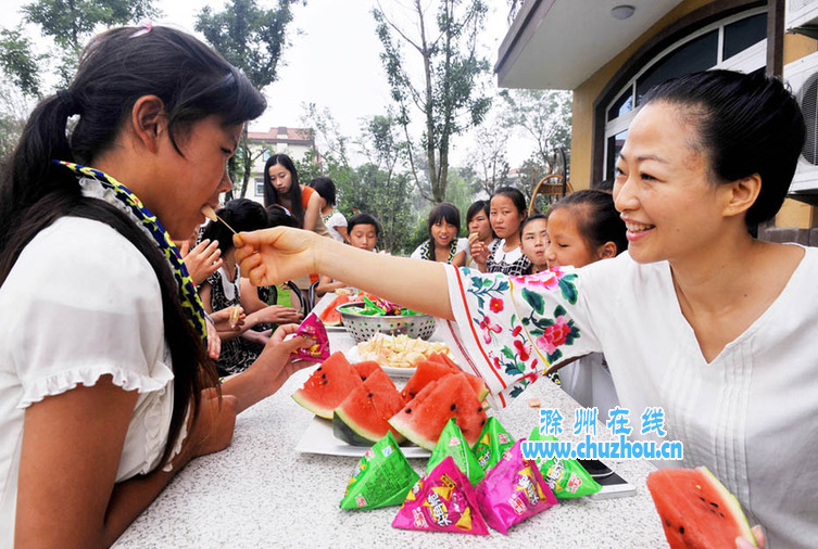 尹乔1996年远离家乡定远县农村到上海打拼创业。为回报家乡和社会,她寻求当地相关部门的帮助,走访了定远县许多乡镇家庭,选定19名贫困家庭女孩及孤儿作为帮扶对象。图为尹乔与接来家中的孩子们一起吃水果、点心。 记者 王家国 摄