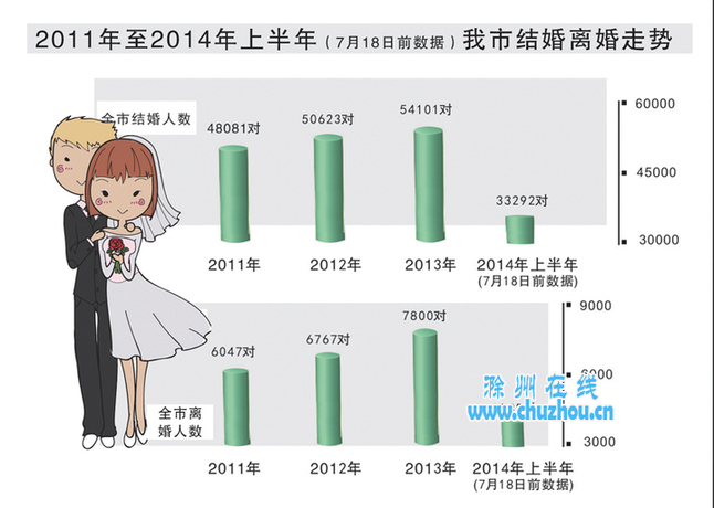 上半年过了个情人节,过了个“5·20”,下周又将迎来中国传统“七夕”节,在大家的印象中,结婚的理由越来越多、人数也越来越多了,但据记者从市民政部门获得的近三年的调查数据显示,我市的离婚人数正在以每年10%左右的速度攀升,甚至每年离婚人数的增长率超过了结婚人数增长率。滁城主城区琅琊区的结婚离婚的比例更是达到了3:1,也就是说每3对新人结婚的同时,就有1对夫妻离婚。