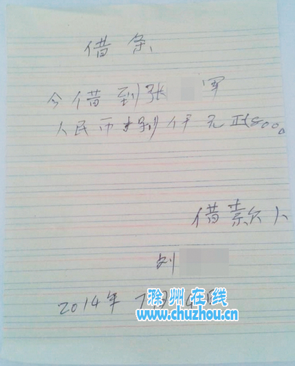 随后,张某方写好条子,让刘某某抄写。“今借到张某军人民币捌仟元正”,读了一遍刘某某抄写的借条,张某军觉得不妥。于是,刘某某根据张某军的要求,又抄写了另外一份,“2014年7月14号晚,偷盗西瓜被抓住,我自愿赔偿西瓜款捌仟元正”。