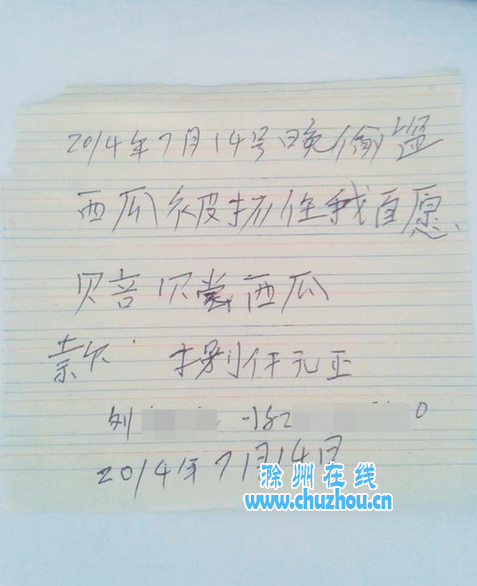 日前,南谯区大柳镇村民刘某某,险些花8000元买了6个“天价西瓜”。原来,他骑摩托车到别人瓜地里偷瓜,不想被瓜农发现。因担心派出所处罚,刘某某只得按照对方要求,写下“自愿赔偿西瓜款捌仟元”的条子。