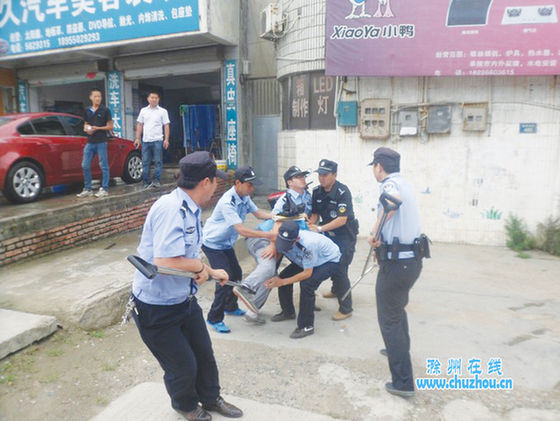 来安县公安局民警迅速赶到,大声呼喝吸引打人男子注意力。打人者被引开之后,一名民警举起警用防暴钢叉,果断将其腿部控制,其他民警迂回包抄把他牢牢按住。随后,行凶男子手中一把20厘米长的水果刀,被民警强行夺下。