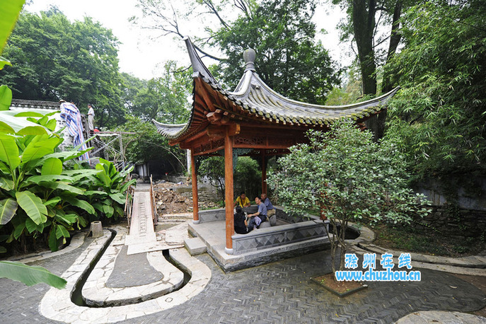 为切实了解醉翁亭古建筑群的修缮情况,记者近日专门走访了正在施工的醉翁亭核心景区。在意在亭内,记者发现支撑亭体的四根水泥柱已经被换成了木柱,环绕亭前的曲水流觞也已具备蓄水功能。在二贤堂前,一幢仿照原样建设的新二贤堂已经落成;此外,影香亭、宝宋斋等10余处古建筑也已基本修缮完毕;特别值得一提的是,为了保护菱溪石,琅琊山管委会根据专家建议,在怡亭前的空地上新建了一个亭子,并将菱溪石迁入其中。