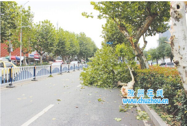 本网讯 8月29日中午11时许,滁城丰乐大道丰乐菜场附近,一辆装满“二师兄”的大货车,接连撞断路边两棵行道树。