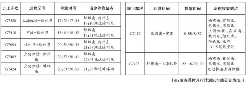 “根据上级铁路部门安排,今年中秋节期间,我们站计划增开7趟临时旅客列车,其中,上行5趟、下行2趟(临客车次及停靠时间等详见附表),具体开行日期以客调命令为准。”滁州站站长陶仁宝在采访中这样告诉记者,“特别值得一提的是,此次增开的临客均为‘G’字头旅客列车,运营区间也主要集中在上海和徐州之间。”
