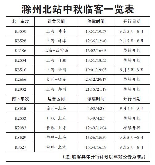 “根据上级铁路部门安排,今年中秋节期间,我们站计划增开12趟临时旅客列车,其中,上行7趟、下行5趟(临客车次及停靠时间等详见附表)。”滁州北站副站长曹广祥在采访中如是说。经查,此次增开的临客分为两类,其一是直通临客,包括K2666、K2503/K2504等,其二是管内临客,包含K8515/K8516、K8528等,运营区间则主要集中在上海、蚌埠、郑州、长春等地。