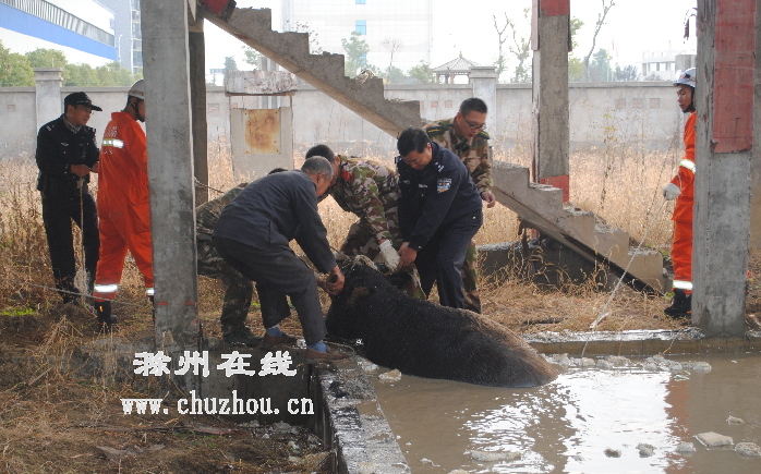 8时17分,天长市炳辉派出所的几位民警赶到现场,发现那口水泥池高约2米,正方形,四壁直立,没有上下通道。民警一边想法营救,同时请求消防官兵前来增援。很快,消防车载着8名官兵赶到现场。经过探查,救援人员决定先向水中沉入水泥涵管,给水牛垫脚,然后,用绳索将水牛拉上岸来。9时40分,水牛被成功营救上岸。