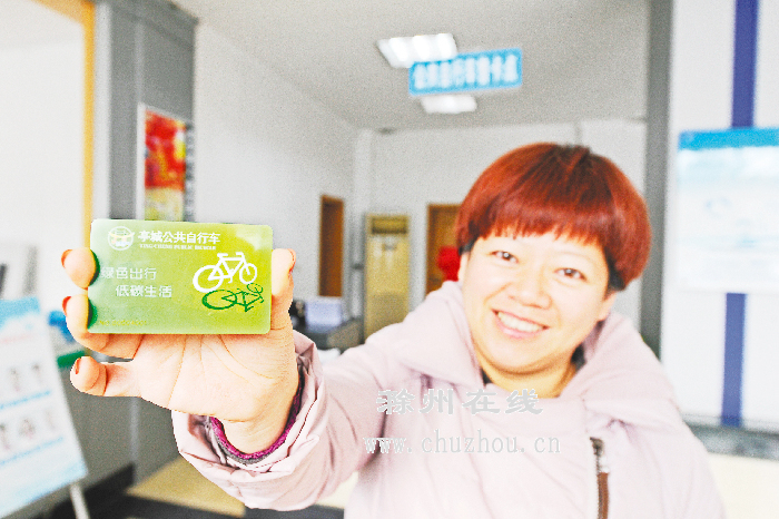 目前,滁城首批1300辆公共自行车已进入最后调试阶段,预计12月20日左右“上岗”。届时,凡是办了卡的市民都可骑上轻便的公共自行车逛一逛。图为首张公共自行车卡用户在展示新办的卡。