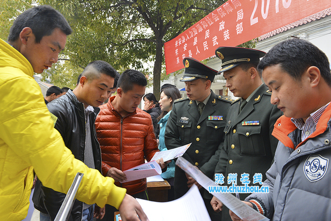1月5日,来安县人武部、民政局、人力资源社会保障局联合举行退役士兵就业招聘会,准备了800多个就业岗位供168名退役士兵挑选。其中有106名退役士兵当场与用工单位签订了就业意向书。图为招聘会现场。