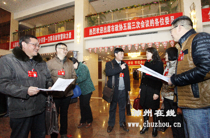 市政协五届三次会议、五届市人大三次会议分别于1月14日、15日在滁召开。图为前来报到的政协委员们在相互讨论提案。记者李晓村 卢志永摄