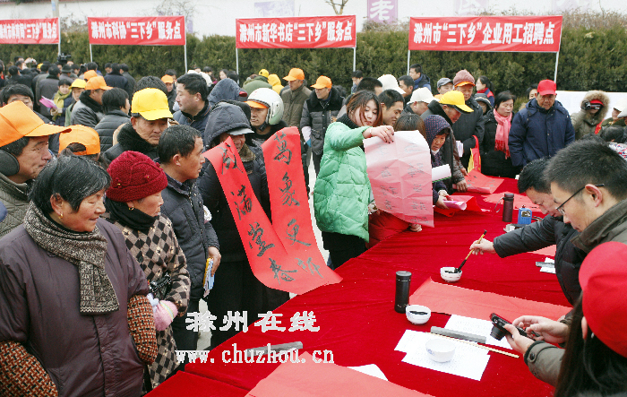 1月27日,我市2015年文化科技卫生三下乡活动启动仪式暨集中服务月活动在来安县半塔镇举行。市文广新局、市卫生局、市科技局等10多个部门单位准备了丰富多彩的文化、卫生、科技、农业、法律等方面的宣传信息资料和便民服务活动,并向该镇捐款捐物。开展送演出、送农技、送岗位、送书籍、写春联等形式多样的服务,极大地丰富了农民群众的精神文化生活。图为书法家们在为老区人民书写春联。通讯员郭 超 记者卢志永摄